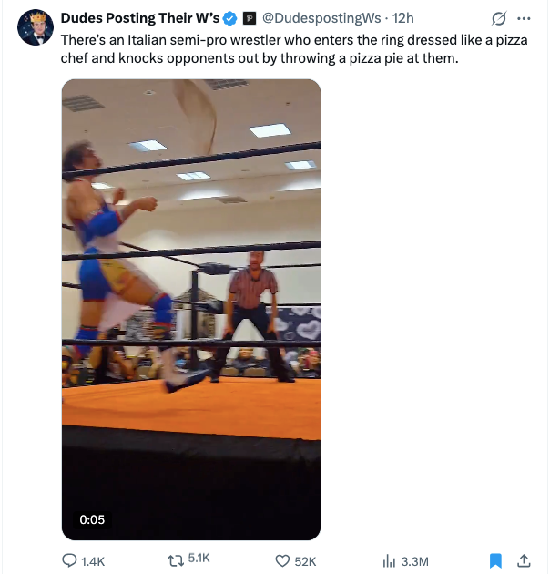 An Italian wrestler knocks out his opponents by throwing pizza dough at them