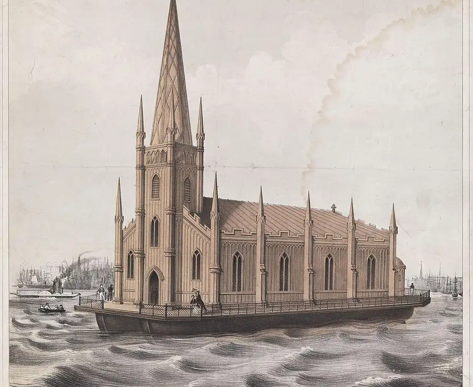 From Boing Boing: "In the mid-19th century, the Seamen's Church Institute began bringing floating chapels to sailors who couldn't leave their work to attend church services on land. One such vessel was the Floating Church of the Redeemer, built by the Institute's Philadelphia branch. While no photographs exist of this floating church, surviving drawings depict a whimsical, fairytale-like structure. However, according to souirces, the church faced several practical challenges: congregants experienced seasickness, the pastor struggled to maintain balance during services as the vessel rocked on the waves, and the church even sank once. These difficulties proved insurmountable. After 10 years of service, the Floating Church of the Redeemer was sold and relocated to Camden, New Jersey."
