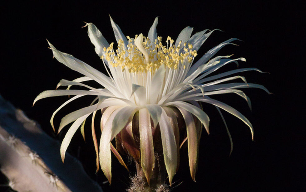 It’s not so much astounding that she still exists somewhere out there, blooming only once a year, for one night only. What’s most amazing to me about the night-blooming cereus, or “queen of the night,” is how extraordinarily white the blossom is in total darkness. Almost phosphorescent. Amazing, too, is the enormity of her blossom — that pent-up desire, the yearning for beauty. Her brief intoxicating fragrance, which rivals magnolia and gardenia, suggests vanilla and the sassy power of citrus. She is worth dreaming about, even searching for and seeing if you know where to look. Some years, the meteorological conditions are terrible, and yet she appears; other years, everything seems just right, and yet she stays hidden, dormant, waiting for a better year, finicky. It’s an extreme and flamboyant Hail Mary way of life that occurs in deserts and subtropics around the world. In Chinese folklore, night-blooming cereus blossoms represent unfulfilled love. Others believe the blossoms bring good fortune and grant wishes. (via Texas Highways)
