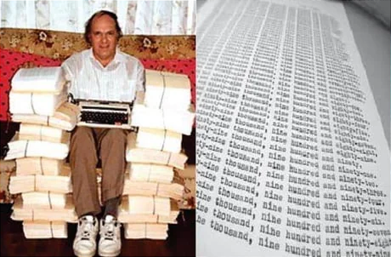 From the BBC: "A man who took 16 years to type a million words with one finger won a place in the Guinness World Records book. Les Stewart of Queensland, Australia began typing the numbers from one to a million - in words - in 1982. He finished 16 years and seven months later, having got through seven manual typewriters, 1000 ink ribbons and 19,990 sheets of paper making it the world's longest typewriting marathon. Mr Stewart embarked on his Herculean task after injuries sustained in a house fire left him unable to work. His condition also meant he could only type with one finger. It took him two hours to complete each page and he averaged three pages a day. perhaps more bizarre than his world record achievement, is the fact that Les threw out all but two of the 19,890 pages he typed over those fifteen years. "I just put them in the recycling bin, we’ve got too many things in the house,” he said. “But I kept the first and the last page.”