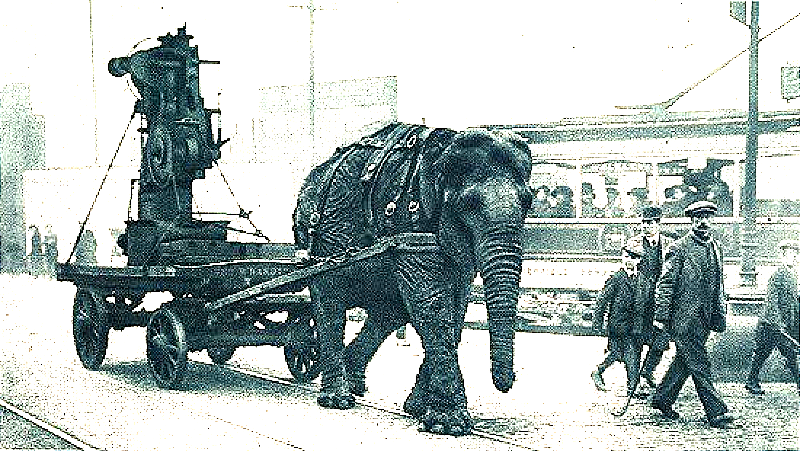 From Wikipedia: "During the First World War, many horses were taken from private hands for the war effort, including at least three belonging to Thos. W. Ward Ltd. To replace these horses, owner Thomas W. Ward rented Lizzie from Sedgwick's around February 1916. To prepare Lizzie for pulling carts around the Thos. W. Ward yards, she was outfitted with a custom harness and leather boots to protect her feet from any metal lying on the ground (which was prevalent on the Thos. W. Ward yards). Although an unorthodox replacement, Lizzie was well suited to the task. She had been accustomed to training while in the menagerie, and was used to being around many people. Lizzie quickly became a well-loved icon of the city. Many locals would even bring her treats. Camels, likely also from Sedgwick's Menagerie, were employed in similar fashion around Sheffield. However, they never became as popular as Lizzie did."