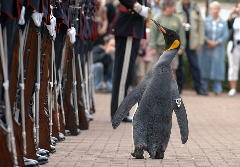 The family of Norwegian shipping magnate Christian Salvesen gave a king penguin to Edinburgh Zoo when the zoo opened in 1913. When the Norwegian King's Guard visited the Edinburgh Military Tattoo of 1961 for a drill display, a lieutenant named Nils Egelien became interested in the zoo's penguin colony. When the King's Guard returned to Edinburgh in 1972, Egelien arranged for the regiment to adopt a penguin. This penguin was named Nils Olav in honour of Nils Egelien, commander of the drill platoon, and Olav Siggerud, contingent commander of HMKG in 1972. Nils Olav was initially given the rank of lance corporal. He has been promoted each time the King's Guard has returned to the zoo. He was made a corporal in 1982, then promoted to sergeant in 1987. Nils Olav I died shortly after his promotion to sergeant in 1987, and his place was taken by Nils Olav II, a two-year-old near-double. (via Wikipedia)