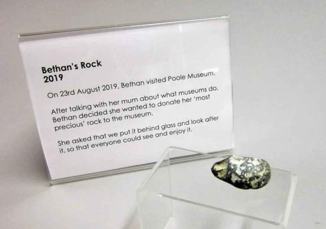 On 23 August 2019, a five-year-old girl named Bethan and her mother visited the Poole Museum in Poole, England. Following a discussion with her mother regarding the function of museums, Bethan chose to donate her favourite rock, originally found on a beach by her grandmother and given to her. As she left the museum, Bethan approached the front desk and asked if they could place the stone behind glass and look after it so that everyone could see and enjoy it. Within weeks, the rock was placed on display in a glass case and labelled "Bethan's Rock – 2019". Bethan's Rock is a small grey and white stone. It is displayed in a glass cabinet, alongside a printed note about the donation. The museum's staff have described the object as highlighting that "treasures don't have to be rare," and the rock is now the museum's most popular exhibit. (via Wikipedia)
