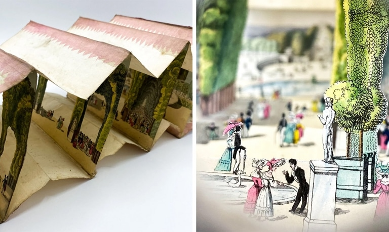 Paper peepshows, also known as peek-a-boo books, peepshow books, and tunnel books, are a special form of immersive storytelling. They’re made up of several pages bound together by folded pieces of paper on each side. When folded out, these books are accordion-looking. Each page is carefully crafted with cutouts to reveal the page behind it, adding to the illusion of depth and perspective. The viewer looks through the small hole in the front, enveloping themselves in a tiny, three-dimensional scene that feels life-sized. As the Victoria and Albert Museum describes, traveling peepshow men “would charge adults and children to look inside the box, while commenting on the scene depicted and bringing it to life.” Peepshows were inspired by the theatrical stage.