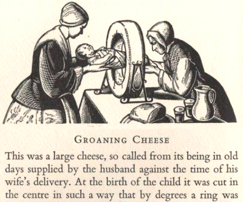From Neatorama: "In 1777, John Brand, an English folklorist, published a book called Observations on Popular Antiquities. In it, he described the customs of the people of England that might not be known among the upper classes of that nation. In one passage, he wrote about a custom in which a newborn child is passed through a hole cut in the center of a wheel of cheese on the day of the child's christening. "It is customary at Oxford to cut the cheese (called in the north of England, in allusion to the mother's complaints at her delivery, the Groaning Cheese) in the middle when the child is born, and so by degrees form it into a large kind of ring, through which the child must be passed on the day of the christening. In some villages, the cheese is then cut and distributed to women as an aphrodisiac, so they might "dream of their lovers."