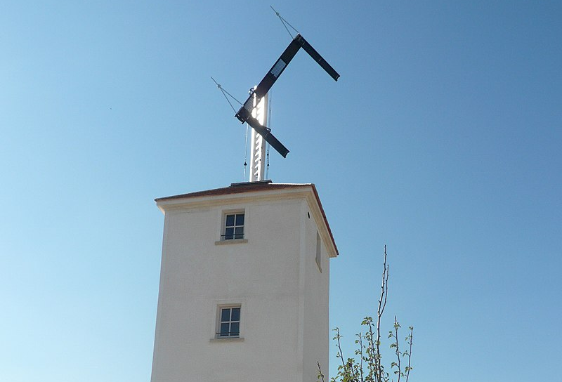 From Wikipedia: "The Chappe telegraph was a French semaphore telegraph system invented by Claude Chappe in the early 1790s. The system was composed of towers placed every 5 to 15 kilometers. Coded messages were sent from tower to tower, with transmission being handled by tower operators using specially designed telescopes. The messages were decoded once they reached their destination city. By the mid 19th century, the network spanned several hundred kilometres and covered most major French cities as well as Venice, Mainz, and Amsterdam. The system was dismantled after the introduction of the electric telegraph. Today, about twenty Chappe towers remain, in varying states of repair. The typical tower's signaling mechanism was visible through specially designed telescopes from a neighboring tower, 5 to 15 km away."