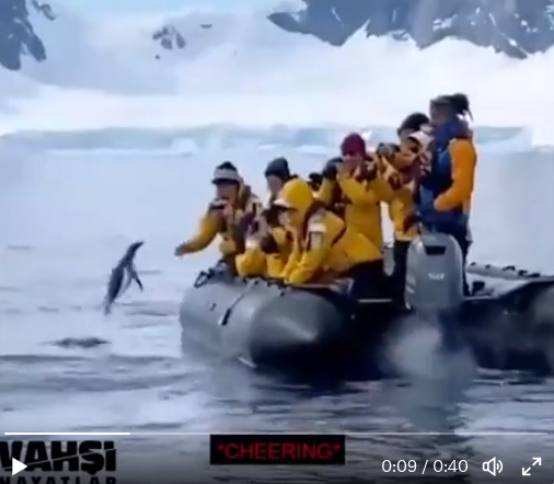 A Gentoo penguin leaps into a whale-watching boat to escape a killer whale