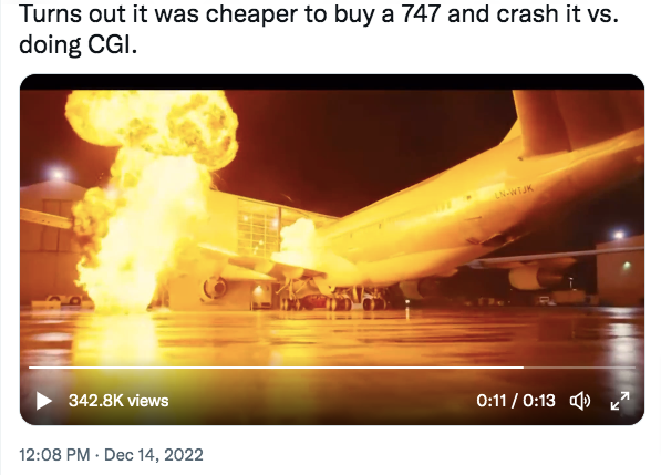 I don't usually link to Twitter threads, but this one stuck out so I am making an exception – it's from Trung Phan, who is a business writer and obviously a Christopher Nolan fan. In the thread, he gives a few examples of Nolan's commitment to using live-action shots instead of doing everything with CGI, which seems to be the default choice for a lot of directors. One example: In the movie "Interstellar," there are a number of shots of people driving through a cornfield – Nolan spent $100,000 to plant 500 real acres of corn in Alberta, and then after filming, he sold the crop for a profit. Example 2: In the movie "Tenet," he actually crashed a full-sized 747 into an airplane hanger, which not only looked more authentic but turned out to be cheaper than doing it with CGI.