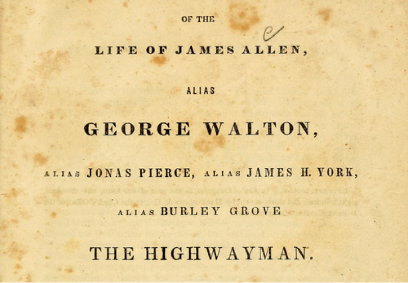 "The Narrative of the Life of James Allen, alias George Walton, alias Jonas Pierce, alias James H. York, alias Burley Grove, the Highwayman, Being His Death-bed Confession to the Warden of the Massachusetts State Prison" is an autobiographical work published in Boston by Harrington and Co. in 1837. While many copies of the book are extant, the book is most often associated with the copy in the collection of the Boston Athenaeum. This copy was bound in the author's own skin, tradition holding that Allen requested that a copy of his confession be bound in his skin and given to John A. Fenno Jr., who had earlier resisted Allen's attempt to rob him. The binding has been scientifically confirmed to be human skin, according to the Anthropodermic Book Project, which seeks to confirm or deny cases of books allegedly bound in the material. (via Wikipedia)
