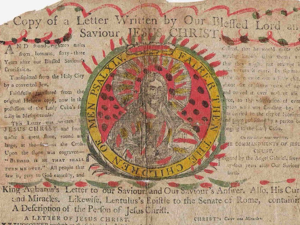 One predecessor to chain letters is the so-called “Letter from Heaven,” emerged during or prior to the medieval period. Marketed as messages from Jesus himself, these purportedly divine missives conveyed instructions (celebrate the Sabbath on Sunday rather than Saturday, fast on five Fridays each year, do not gather vegetables on Sundays) and conferred protection on those who sent them to others. Some claimed “to have fallen from the heavens,” while others were said to be written in Jesus’ own blood. An English version dated to 1795 declared “[H]e that publisheth it to others, shall be blessed of me, and though his sins be in number as the stars of the sky, and he believe in this he shall be pardoned; and if he believe not in this writing, and this commandment, I will send my own plagues upon him, and consume both him and his children, and his cattle.”