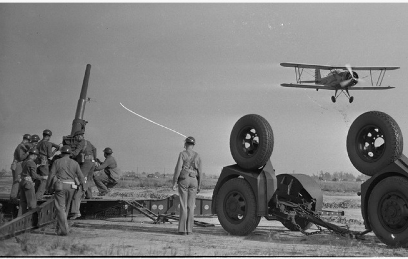 On the evening of February 24, 1942, an anti-aircraft barrage of more than 1,440 rounds is launched at what is initially thought to be a Japanese aerial attack on the City of Angels. Five civilians die – three from traffic accidents spawned by the chaos and two from heart attacks. What, if anything, is being fired upon remains a mystery. Theories include weather balloons, UFOs, birds, or just jitters by Angelenos with Pearl Harbor still a fresh memory and, even fresher, a Japanese submarine torpedoing a Santa Barbara oil field on February 23. Regardless of cause, air raid sirens first blare at 7:18 p.m. Thousands of air raid wardens go to their posts throughout Los Angeles County. That alert is lifted at 10:23 p.m. Tensions ease. Then, after midnight, all hell breaks loose. According to the Los Angeles Herald Examiner a witness puts the number of planes at 50. Three are shot down over the ocean. (via Celebrate California)