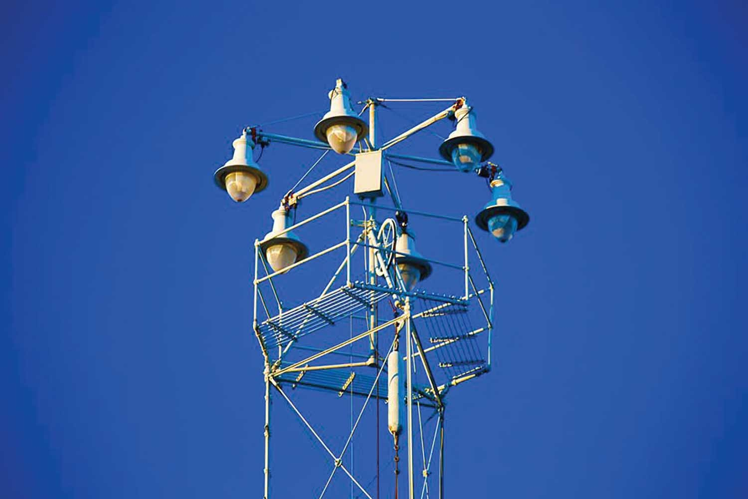 From Texas Time Travel: "Before streetlights were ubiquitous, some cities like Austin, Texas used what they called Moonlight Towers to generate light in the evenings. Each of these towers, built between 1894 and 1895 by the Fort Wayne Electric Company, are constructed of a triangular-shaped cast and wrought iron framework and topped with a cluster of six lamps designed to shower a “moon-like” glow upon everything within a 3,000-foot diameter circle below. The original lamps were carbon arc, requiring workmen to light or extinguish two pieces of carbon that produced the illumination. The workmen accessed the clusters twice daily via a small, hand-operated elevator that ran up the center of each tower’s framework. Eventually, incandescent lighting and then mercury vapor lamps were used, allowing for the installation of an on/off switch. Originally, 31 of the 165-foot tall towers were built, and 15 are still in operation."