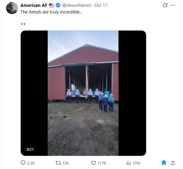 A group of Amish men lift and carry a giant barn
