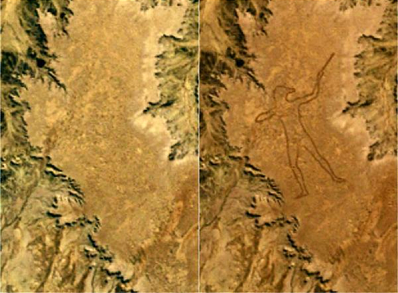 In 1998 in the Australian Outback, 36 miles from the tiny town of Marree, an almost two-mile long drawing of a man appeared in the dessert. The satellite image on the left was taken on May 27, 1998, and the image on the right was taken on June 12th. Sometime in between, a figure of an Aboriginal hunter was plowed into the ground. No one noticed it until July, when a set of faxes were sent to Marree, and a local pilot went out to take a look. Who drew the Marree Man? It wasn't the local Aboriginals, who own the land. A local man who had a tractor and was said to have access to the then-new technology of GPS was suspected. An American flag was found on the ground at the work, throwing suspicion on American defense workers. An Australian artist said he did it, but his story wasn't that credible. Tour operators were suspected, because they would have profited from the art. We may never know exactly who carved the geoglyph. (via Neatorama)