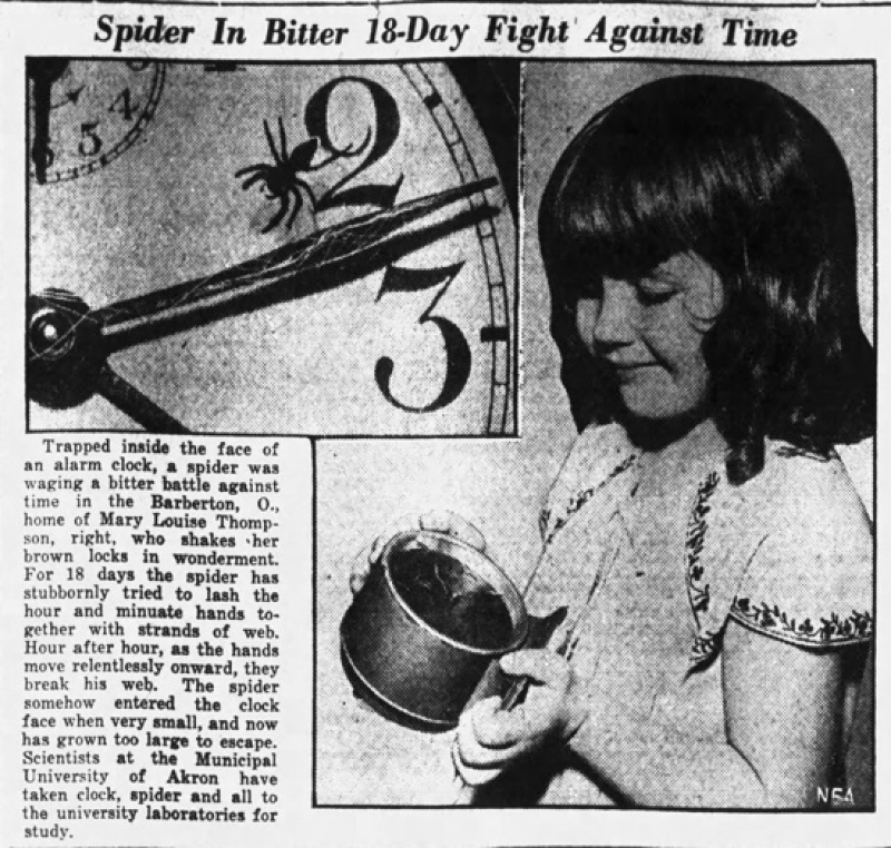 From Weird Universe: "The Internet has made many animals famous, such as Grumpy Cat, Darwin the Ikea Monkey, and Sockington the Twitter Cat. But Internet-famous animals tend to be either pets or species that biologists describe as "charismatic." This hasn't always been the case. If we look back to 1932, we find an example of a spider that achieved overnight celebrity status, with the media producing daily reports of its adventures. The spider's rise to fame began on the morning of November 20, 1932 at 552 Parker Ave in Barberton, Ohio. Louise Thompson rolled over in bed, turned off her alarm clock, and then noticed a "tiny black dot" moving across the face of the timepiece. Closer examination by her husband, Cyril, revealed that the dot was a small spider. It had somehow gotten into the space between the face of the clock and the glass, and it was attempting to spin a web between the minute and hour hands."