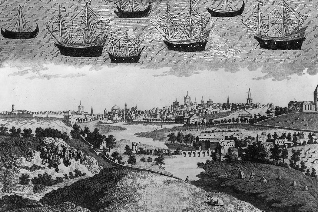 In the Clonmacnoise Annals for the year 743 something most unusual was recorded by the monks that lived at the site. Early on a bright Sunday morning, right when the parishioners from the nearby town were literally packed into the stone walled chapel on the grounds of the Clonmacnoise Monastery, a large object – or a fleet of objects – crossed the skies above the church and blotted out all of the sunlight that was coming in through the stained glass windows. Soon hundreds of townspeople and dozens of monks were gathered on the lawn outside the church and looking up at what they believed to be a fleet of flying sailing ships so dense in the sky above that it blotted out the sun. As the crowd looked skyward a giant, glowing “anchor attached to a long chain” fell from the ship. The glowing chain embedded itself in the ground of the church yard and was dragged along a great distance before it finally came to a stop after it embedded itself in the huge wooden door that marked the entrance to the church. (via Creative History)