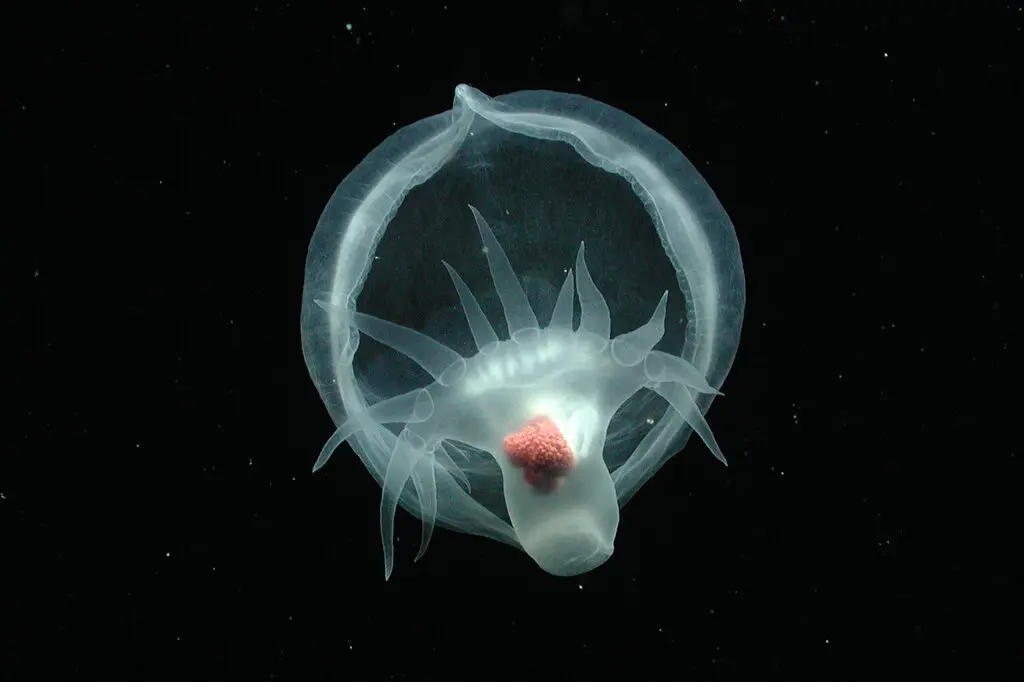 From the New York Times: "Bruce Robison, a marine biologist, has long used robotic vehicles to explore the Monterey Canyon off California — a gargantuan rift of the Pacific seabed that descends rapidly from coastal shallows to a depth of more than two miles. In early 2000, he stumbled on a strange creature he had never seen before. The gelatinous blob had a giant hood at one end, fingerlike projections at the other and colorful internal organs in between. Baffled, Dr. Robison and a colleague at the Monterey Bay Aquarium Research Institute set out to discover what it was. Now, a quarter-century later, the two scientists report that the creature turns out to represent a whole new family of things in the deep ocean — the least explored part of the biosphere."