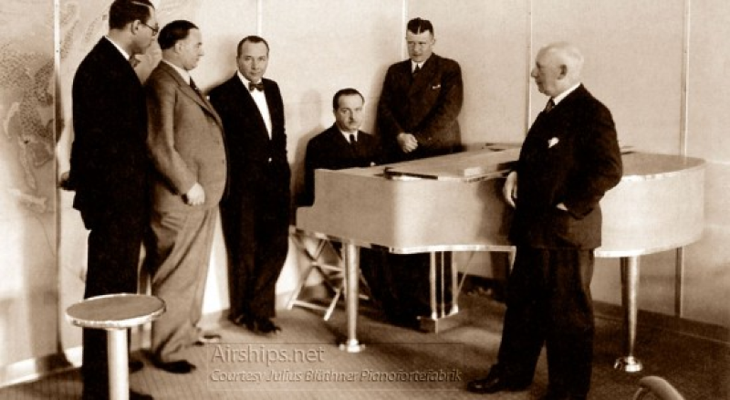 From Airships.net: "To meet the strict weight limits of a lighter-than-air dirigible, the Zeppelin company commissioned the renowned piano making firm of Julius Blüthner to create a lightweight aluminum alloy piano, and the Julius Blüthner Pianofortefabrik created a small grand piano that weighed only 162 kg (356 lbs). The frame, rim, fallboard, and top lid were made of duralumin, and the legs, back bracing, and lyre were made of hollow duralumin tubing. Associated Press reporter Louis P. Lochner, who was a passenger on Hindenburg’s maiden voyage to the United States, commented that the piano had a “particularly large and full tone” despite its aluminum construction.