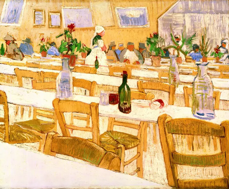 From The Art Newspaper: "For decades Interior of a Restaurant was regarded as a second version of an authentic painting, Interior of the Grand Bouillon-Restaurant le Chalet, Paris. This was understandable, since Van Gogh would sometimes make another version of a composition. The second version of the restaurant scene, which only surfaced in the 1950s, was recently studied after its owner submitted it for possible authentication. The colours also included Manganese blue, a synthetic pigment only patented in 1935. In the original painting the red flowers can be identified as autumn begonias, which graced restaurant tables in November or early December 1887, when the picture was completed. The artist of the second version interpreted them as yellow sunflowers, which would have been over by the end of September."
