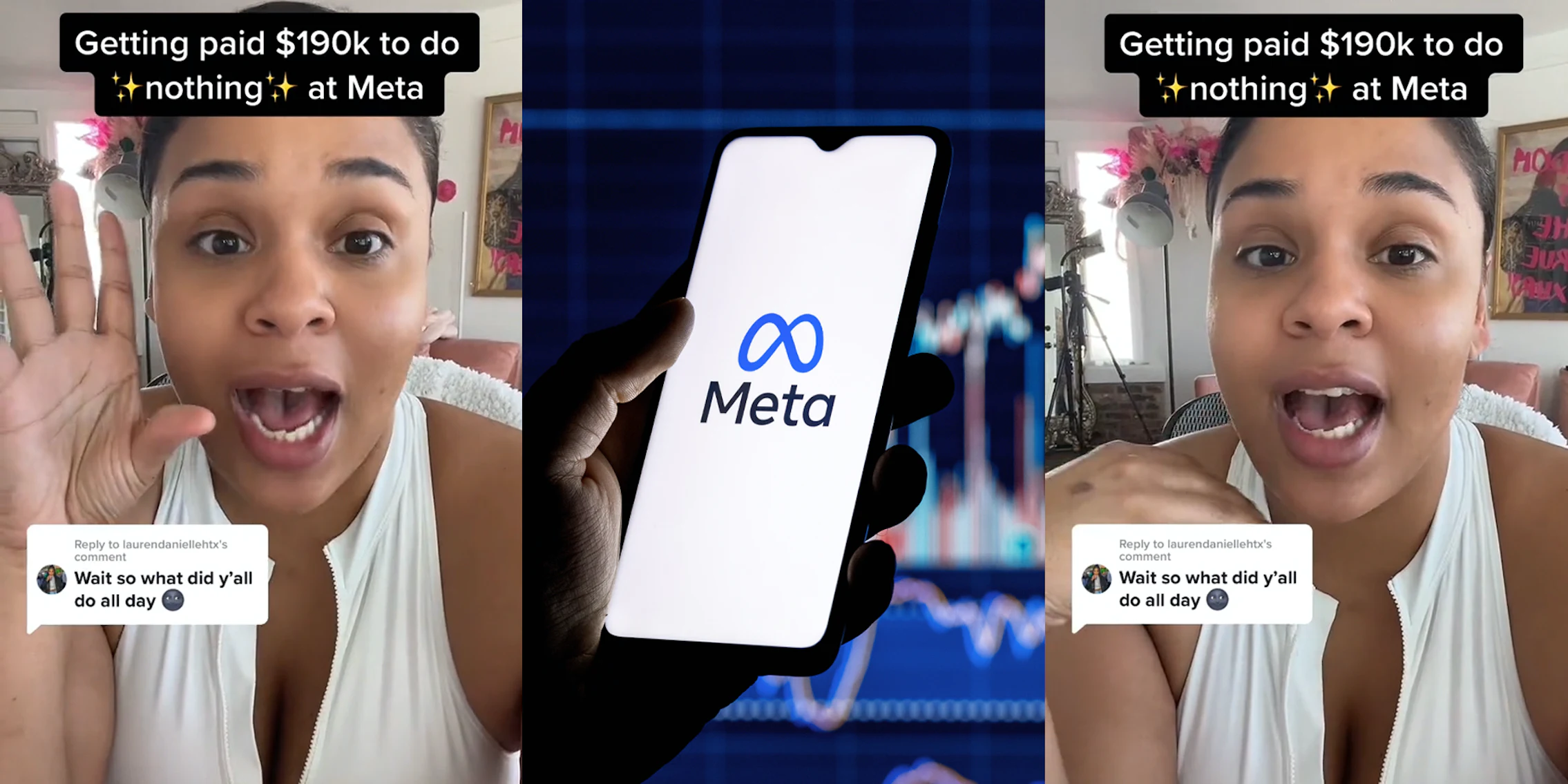 This week, Meta made headlines again after announcing it would be laying off 10,000 workers. These layoffs are in addition to the 11,000 employees it fired in November of last year—meaning that in four months, Meta has let go of over 20,000 workers. In a video with over 122,000 views, TikTok user Maddie (@maddie_macho) writes that she got “paid $190k to do nothing at Meta.” How did this happen? According to Maddie, she was hired to be a recruiter, but was also told that she should not hire anyone for 6 months to a year. Instead of hiring, Maddie said she spent her days going through the company’s onboarding process and attending team meetings—something that confused her. “Why are we meeting? We’re not hiring nobody!” she says in the video.