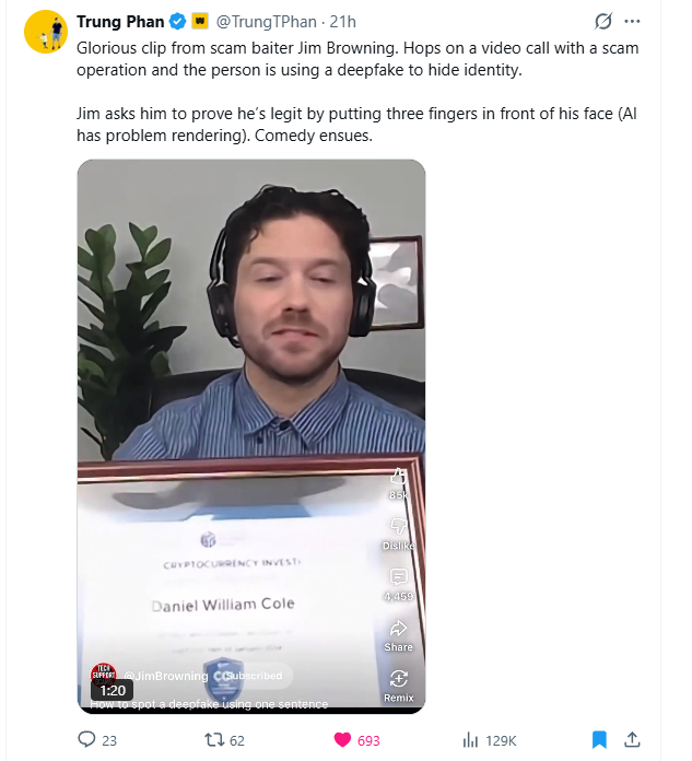 He exposed a deepfake scammer by asking him to hold up three fingers