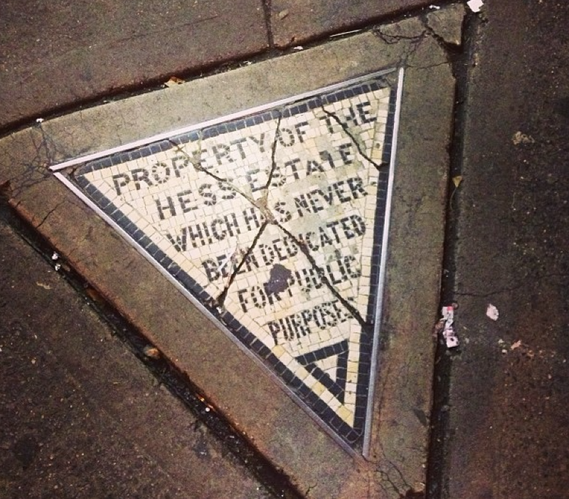 From Wikipedia: "The Hess triangle is a triangular tile mosaic set in a sidewalk in New York City's West Village neighborhood at the corner of Seventh Avenue and Christopher Street. The plaque reads "Property of the Hess Estate which has never been dedicated for public purposes." The plaque is the result of a dispute between the city government and the estate of David Hess, a landlord from Philadelphia who owned the Voorhis, a five-story apartment building. In the early 1910s, the city claimed eminent domain to expropriate and demolish 253 buildings in the area in order to widen Seventh Avenue and expand the IRT subway. By 1913, however, the Hess family had exhausted all legal options. According to the Hartford Courant, Hess's heirs discovered that, when the city seized the Voorhis, the survey missed a small corner of Plot 55 and they installed the mosaic on July 27, 1922."