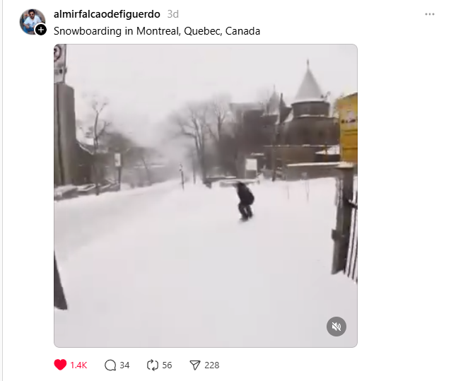 Snowboarding down the snowy sidewalk in downtown Montreal