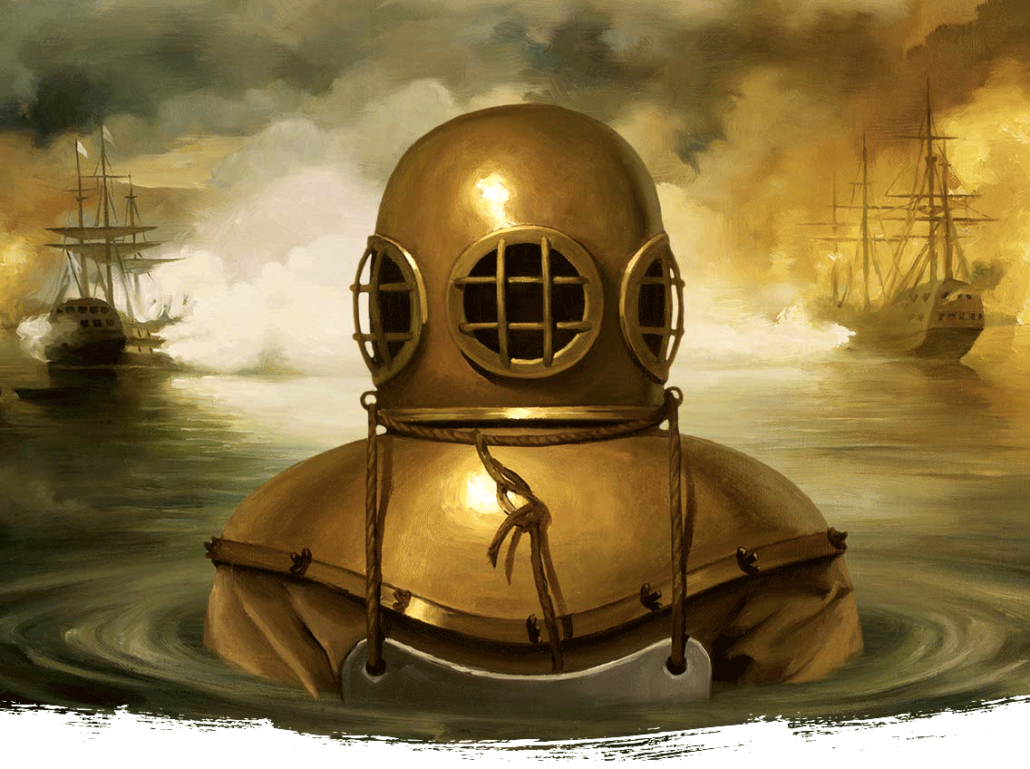 From Epic magazine: "Charles and John Deane, along with a small crew, gathered on the deck of a boat owned by John and readied their equipment. Eighty feet below lay the Royal George and $2.8 million worth of cargo and matériel. It was October 29, 1834, and the Deane brothers were sure that their diving suit was ready for the challenge of reaching the lost battleship. John stood behind Charles and lashed rope into a seal around his brother’s wrists. For insulation, Charles wore an underwear ensemble that included a wicker corset, layers of wool frocks, long johns, and a red wool cap. (The cap would later be adopted and made famous by French marine explorer Jacques Cousteau.) John fixed a safety line around Charles’ leather waist belt, and the crew strapped on 80 pounds of lead for quick descent. Then Charles shuffled to the gunwale, where John carefully placed a gleaming copper helmet over his brother’s head."
