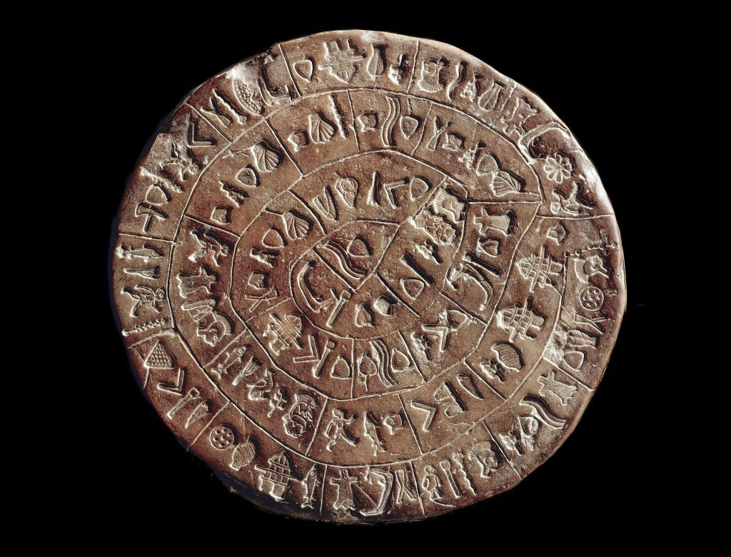 From Artnet: "On a summer day in 1908, Italian archaeologist Luigi Pernier unearthed what would become one of history’s most tantalizing puzzles. While excavating the ancient Minoan palace of Phaistos in Crete, Pernier came across a peculiar artifact: a clay disk roughly the size of a dinner plate, covered on both sides with a spiral of stamped symbols unlike any other ancient writing system known. The object would come to be known as the Phaistos Disk. Since its discovery over a century ago, it has been something of an obsession for many scholars. Nobody really knows who made it or if we’re even holding it right-side up, let alone what language it’s in. What makes the Phaistos Disk particularly mind-bending is its method of creation. Each of its 241 symbols was carefully pressed into the soft clay using individual stamps. The 45 different signs spiral inward from the disk’s edge on both sides, arranged in tidy little groups that closely—and tantalizingly—resemble words."
