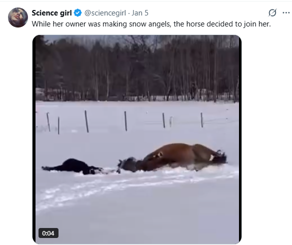 She started making snow angels so her horse decided to lie down and join her