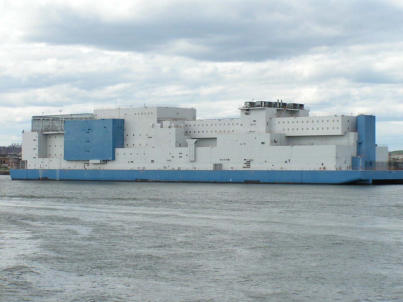 From Wikipedia: "The Vernon C. Bain Correctional Center, nicknamed "The Boat," was an 800-bed jail barge or prison ship that was used to hold inmates for the New York City Department of Corrections. The barge was anchored off the Bronx's southern shore, across from Rikers Island, near Hunts Point. It was built for $161 million at Avondale Shipyard in Louisiana, near New Orleans, and brought to New York in 1992 to reduce overcrowding in the island's land-bound buildings for a lower price. It was designed to handle inmates from medium- to maximum-security in 16 dormitories and 100 cells and was at one time named the world's largest prison barge by Guinness World Records."