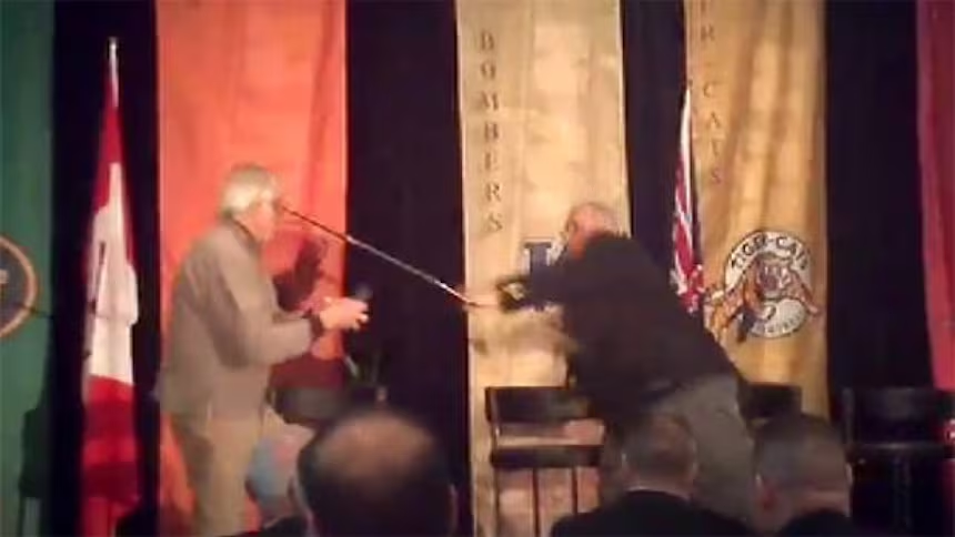 Former CFL legends Joe Kapp and Angelo Mosca became involved in a fight Friday during a CFL alumni luncheon in Vancouver. A video of the incident on YouTube showed Kapp attempting to give Mosca flowers as an apparent peace offering and Mosca rejecting the gesture with an expletive. Kapp, 73, a former B.C. Lions quarterback, then shoved the flowers in Mosca's face, prompting the 74-year-old Mosca, a former Hamilton Tiger-Cats defensive lineman, to attempt to shove them away with his hands. Kapp then swatted Mosca with the flowers, and Mosca retaliated by swinging his cane and striking Kapp in the head. Kapp then landed a right hand to Mosca's jaw, then a left that felled Mosca. "It was the most bizarre thing that's happened to me in 31 years in the game," said comedian Ron James, who was serving as the luncheon's host. (via CBC News)