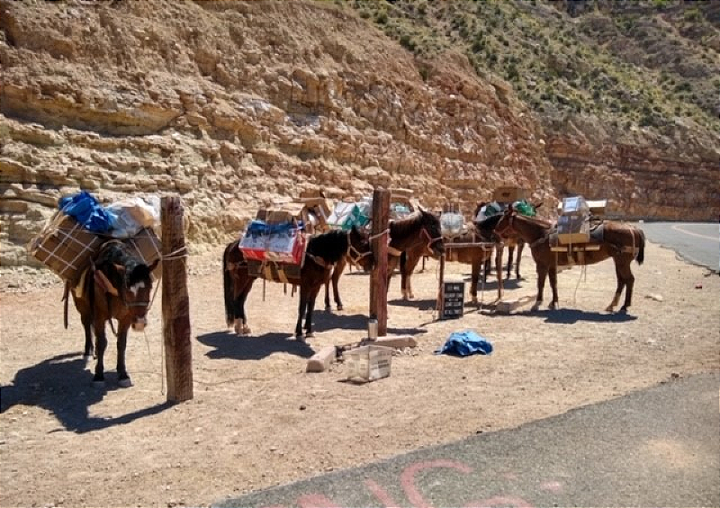get up. On the way up, the wrangler untethers the mules and sends them back on their own. Each mule can carry up to 200 pounds, and the weight is distributed equally on each side of the animal for balance. The Supai Post Office has a special Mule Train postmark. (via the USPS)