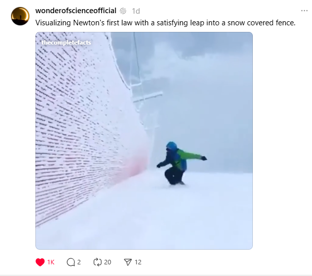 Visualizing Newton's first law of motion with a leap into a snow-covered fence
