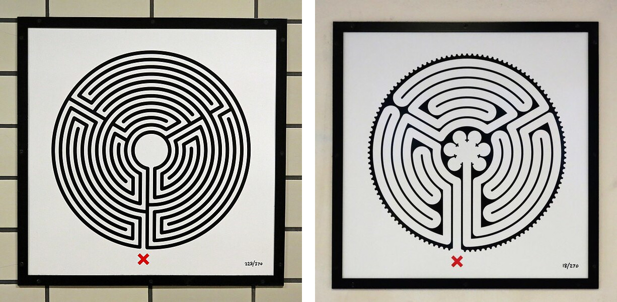 From Futility Closet: "Nearly every station in the London Underground contains an enamel plaque depicting a labyrinth. The collection were installed in 2013 by artist Mark Wallinger to mark the system’s 150th anniversary. Each of the 270 black and white designs is unique to its location, and all of them are posted in publicly accessible locations, so visitors can examine them directly, tracing the path with a finger. They’re numbered according to the route taken by the contestants in a 2009 Guinness World Records challenge to visit all stations in the system in the fastest time. Rendered in black, white and red, the artworks are produced in vitreous enamel, a material used for signs throughout the Underground, including the Tube’s roundel logo, whose circular nature the labyrinth design echoes. A list of all 270 labyrinths is here."