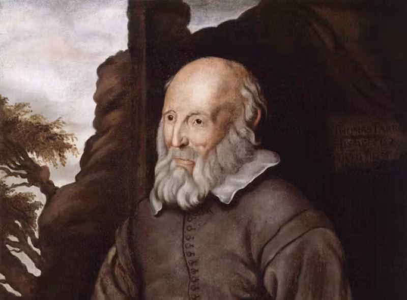 From Public Domain Review: "In the autumn of 1635, a man arrived in London. In itself, this was not an unusual event: London was a thriving metropolis, and the seventeenth century was a time of rapid urban growth. People from across the country (and world) arrived in the capital every day. But Thomas Parr was no ordinary man. He had recently celebrated his 152nd birthday. Something of a late developer in his personal life, he married for the first time at 80, and for the second at 122. Parr was, by all accounts, a hard worker well into his second century, but by 1635 he was beginning to show his age. He could walk with support, but he was also blind, very wrinkled, and had only one tooth. Had the Earl of Arundel not decided to pay a visit to his Shropshire estates that summer, Parr would surely have died in rural obscurity. But Thomas Howard was an enthusiastic collector of antiquities, and when he heard of the existence of a 152-year-old man, the earl decided that this marvel must be taken to London."