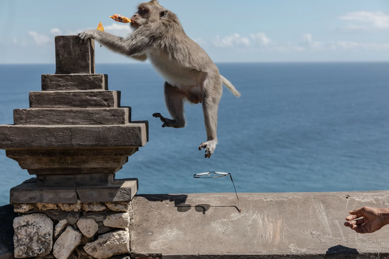 From the WSJ: "At a cliff-side temple on the tropical island of Bali, an unexpected group of criminals is running one of the world’s most sophisticated scam operations.Every week, they steal dozens of phones, wallets and other valuables from tourists in broad daylight and exchange them for handsome rewards. It’s been going on for decades and nobody’s been able to stop it. The culprits? Long-tailed macaques. Tourists flock to Uluwatu Temple, which dates back to at least the 11th century, and the roughly 600 monkeys that inhabit it are considered to be sacred guardians of the temple. Researchers have found that the macaques steal belongings to use as currency to trade with humans for food. Some monkeys can distinguish between objects we highly value (smartphones, prescription glasses, wallets) and those we don’t (hats, flip flops) — and will barter accordingly, according to a University of Lethbridge team that spent years filming the macaques and analyzing hundreds of hours of footage."