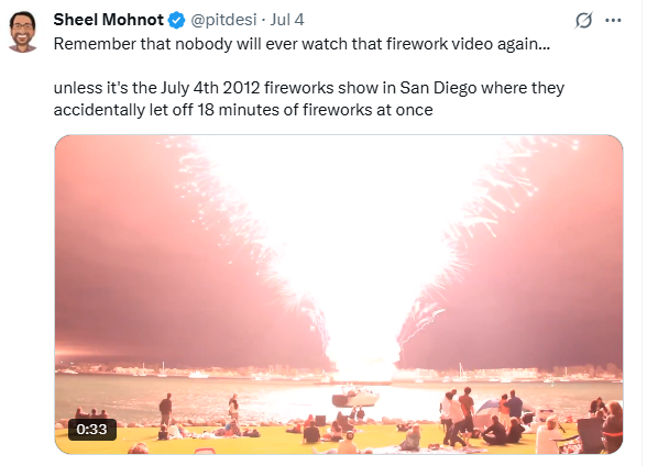 On July 4th 2012 in San Diego all of the show's fireworks went off at the same time