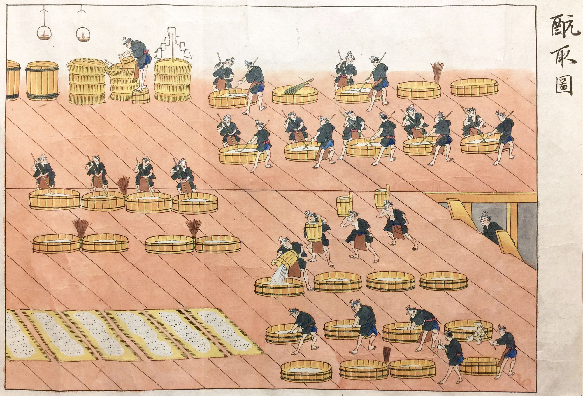 Nearly 7 metres long, an illustrated handscroll made around 1850 shows the process of making sake in 16 consecutive painted panels, including the office and tasting room — depicting the manager, the bookkeeper with his abacus, and shop assistants pouring sake into small containers for customers — and preparing the shubo. Shubo is a mixture of steamed rice, water, yeast, and koji (a sake mould which emits useful enzymes). Sake quality is closely related to yeast quality, and the handling of the shubo - the yeast starter - has always been considered the foundation of sake brewing.