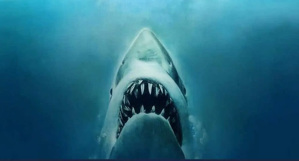 From Ironic Sans: "Due to a fluke of publishing and copyright law, the Jaws shark is public domain. It’s not the character of the shark that’s public domain – or someone would surely be making a low-budget horror prequel about how he became the Amity Island Killer. But I’m talking about the famous shark painting from the movie poster. When the book first came out, it didn’t have this cover art. An old New York Times article about the book’s origin explains that the author, Peter Benchley, actually had his own idea for the cover. He thought it should show “a peaceful unsuspecting town through the bleached jaws of a shark.” The publisher didn't like it. They hired artist Roger Kastel to make an updated version of the cover, and he went to the Museum of Natural History to study sharks, and he had a model pose across a couple of stools for reference of what someone looks like swimming. But it was never copyrighted."