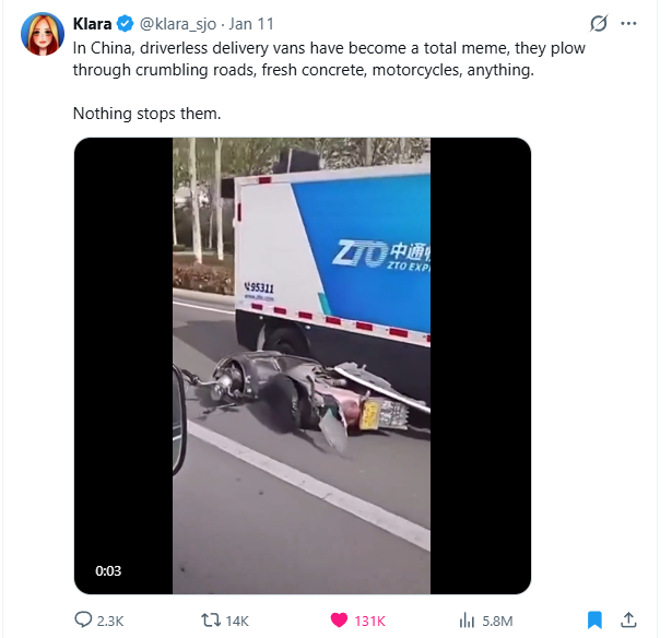 Robot delivery vans have become a meme in China because they don't stop for anything