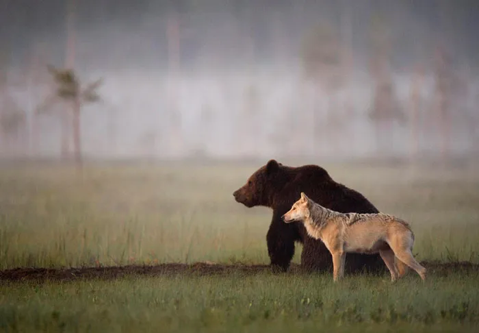 Photographer captures a bear and a wolf, being the best of friends
