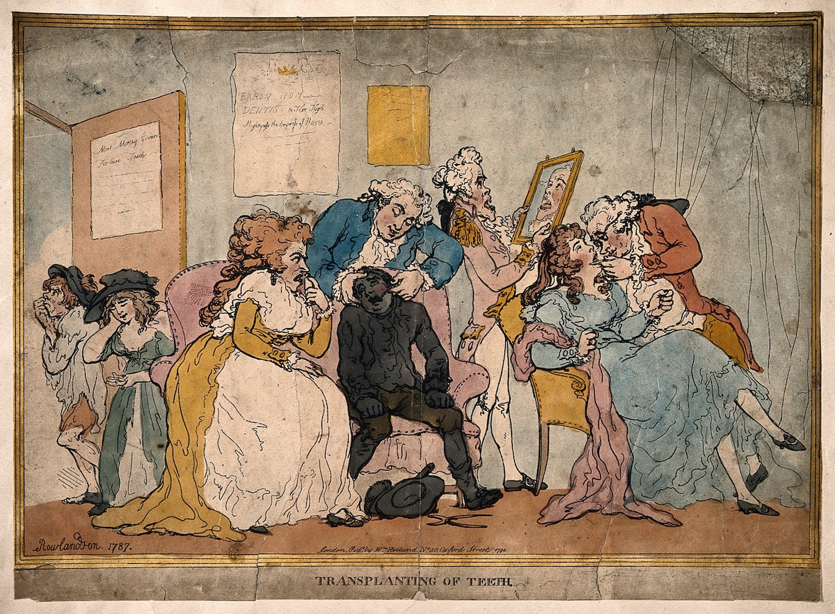 From Northcutt Dental: "Nearly every U.S. schoolchild has heard the story of George Washington and his wooden teeth. It’s speculated that the wooden teeth myth may have started as his false teeth began to stain, possibly taking on the appearance of wood. Washington’s teeth were actually made out of an even more fascinating assortment of materials. They included ivory from a host of African creatures like elephants, hippopotamus & rhinoceros to human teeth. According to MtVernon.org, a site for the museum dedicated to the first president, there was a sordid tooth trade amongst the poorer in the community, who would sell their teeth to dentists, who then used them in dentures for the more wealthy. Teeth from the deceased were also collected by some. There are also receipts that Washington purchased teeth that came from slaves."