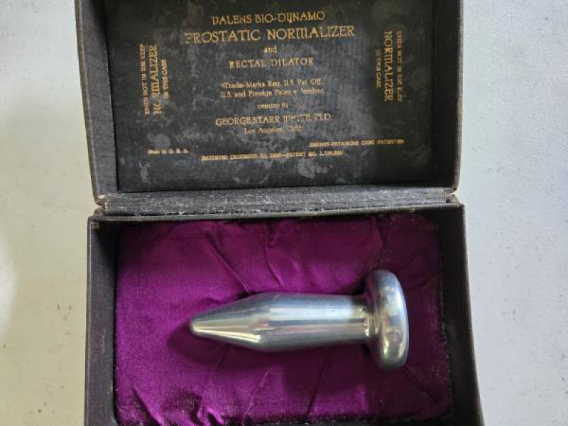 From Get Maude: "The first proper butt plugs complete with flanged ends were marketed as medical devices. “Dr. Young’s Ideal Rectal Dilators” originated in the early 1900s and are immediately recognizable to modern eyes (and still occasionally change hands as collectors’ items). They came complete with a laundry list of ailments they were said to treat: headaches, insomnia, bad breath, acne, anemia, anorexia, hemorrhoids, nervousness, irritability, and cold extremities. Dr. Young also claimed his dilators could cure insanity, making the extremely bold claim that “three-fourths of all the howling maniacs of the world” could be cured. Unfortunately for Young, a lawsuit brought about by the Food and Drug Administration put an end to his rear-based medical shenanigans. The FDA ruled—not entirely insensibly—that his claims were not backed up by any evidence, regardless of how much of his Piloment people were using. The company was dissolved, and all stock was destroyed."