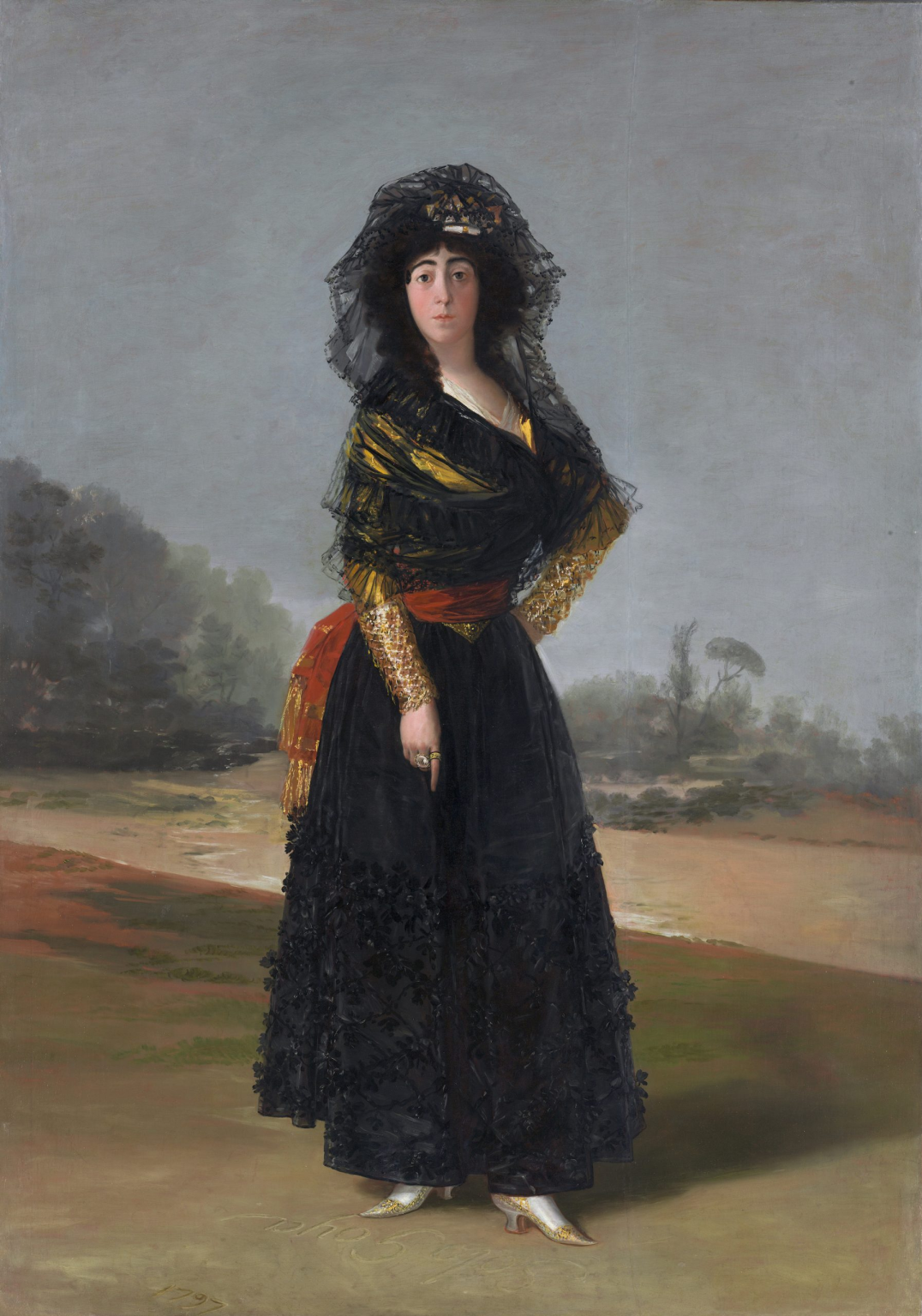 Michael Glover writes in Hyperallergic: "How to define the astonishing allure of this great portrait by Goya? He kept it in his studio for years. In fact, as far as we know, he never parted with it. It defined him. And yet the painting feels both highly personal and strangely set apart, as if the subject possesses all the reality of a vivid human presence and all the unreality of something that can only ever be brittle and unstable, as unreachable and ungraspable as any other object of fantasy. Look at her flushed face, for example, and the drama of those arched black brows. It seems to possess all the fragility of porcelain — or an unbroken egg — and all the clarity of a dream. And her look is … what exactly? A touch sad? A touch helpless? A touch pleading? There is also a certain pride, a certain stiffness, if not haughtiness, in her stance. That face is just a tad mask-like."
