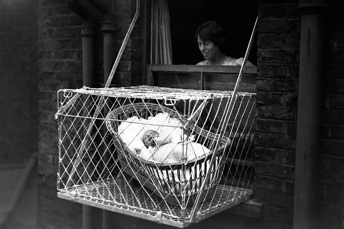 You probably remember your mom being a little more freewheeling about child safety than today's young parents are. Perhaps you roamed aimlessly around the neighborhood until dinner, or rode in a not-so-secure carseat (or, if you were really lucky, a "travel platform"). But new parents from a generation or two ago had nothing on the daring London moms of the 1930s: They literally hung their babies out the window. Dangling "baby cages" came into vogue after they were invented in 1922, but their origin really began with the 1884 book The Care and Feeding of Children, by Dr. Luther Emmett. In his book, Emmett carefully describes how babies need to be "aired to renew and purify the blood." The idea that babies need fresh air persists, regardless of the science behind it — in Scandinavia, little ones in strollers are often parked outside restaurantswhile their moms take a break inside. But whatever was a doting, apartment-living mom to do? Responding to a lack of homes with outdoor space, some London communities began outfitting windows with infant-sized cages for babies to hang out in.