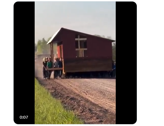 A group of Amish men carry a barn down the road to a new location